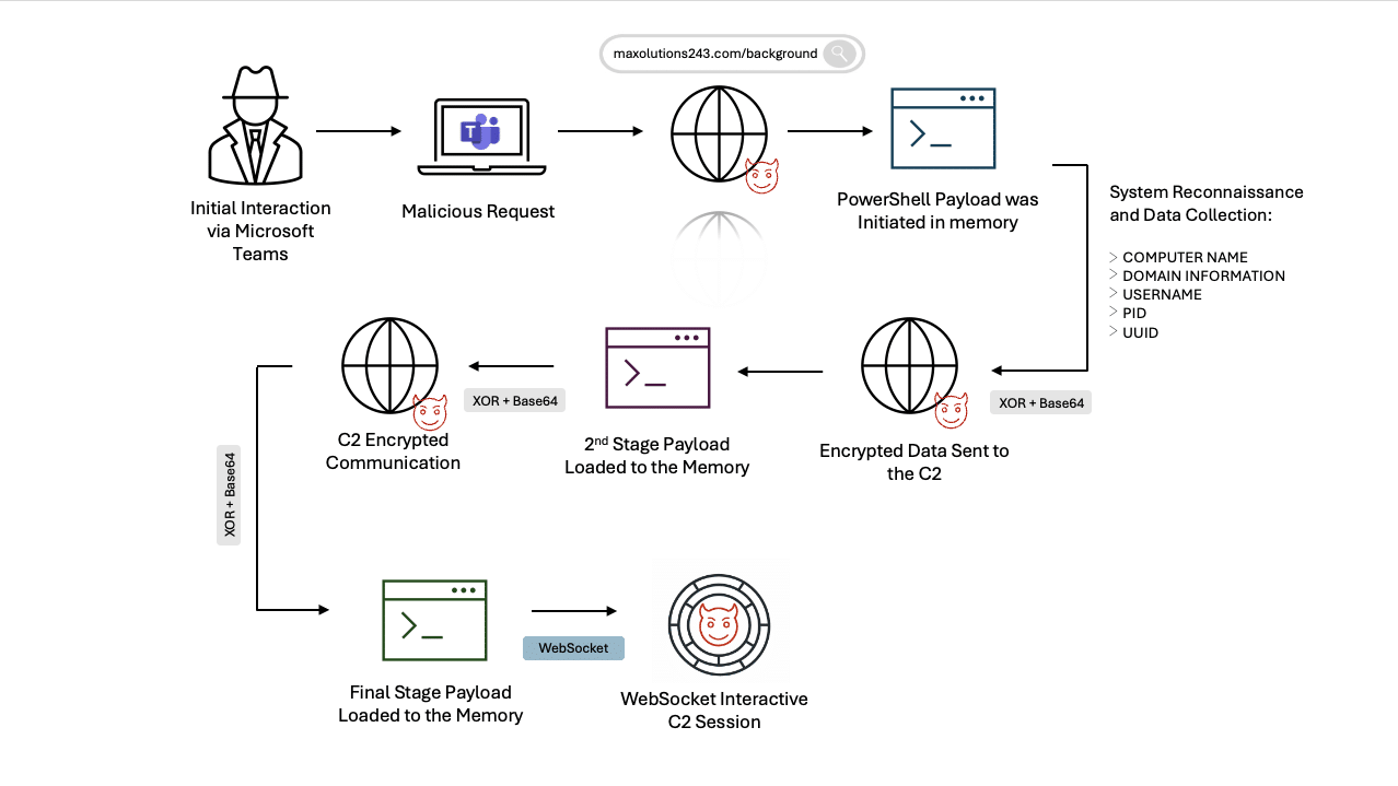 According to our investigation, the victim reported that the engagement occurred through Teams and began with a meeting invite. Our analysis focuses on the observable technical sequence on the endpoint and network layer: following the Teams session, PowerShell execution initiated a staged payload chain that culminated in WebSocket-based command and control. The sequence we observed was: