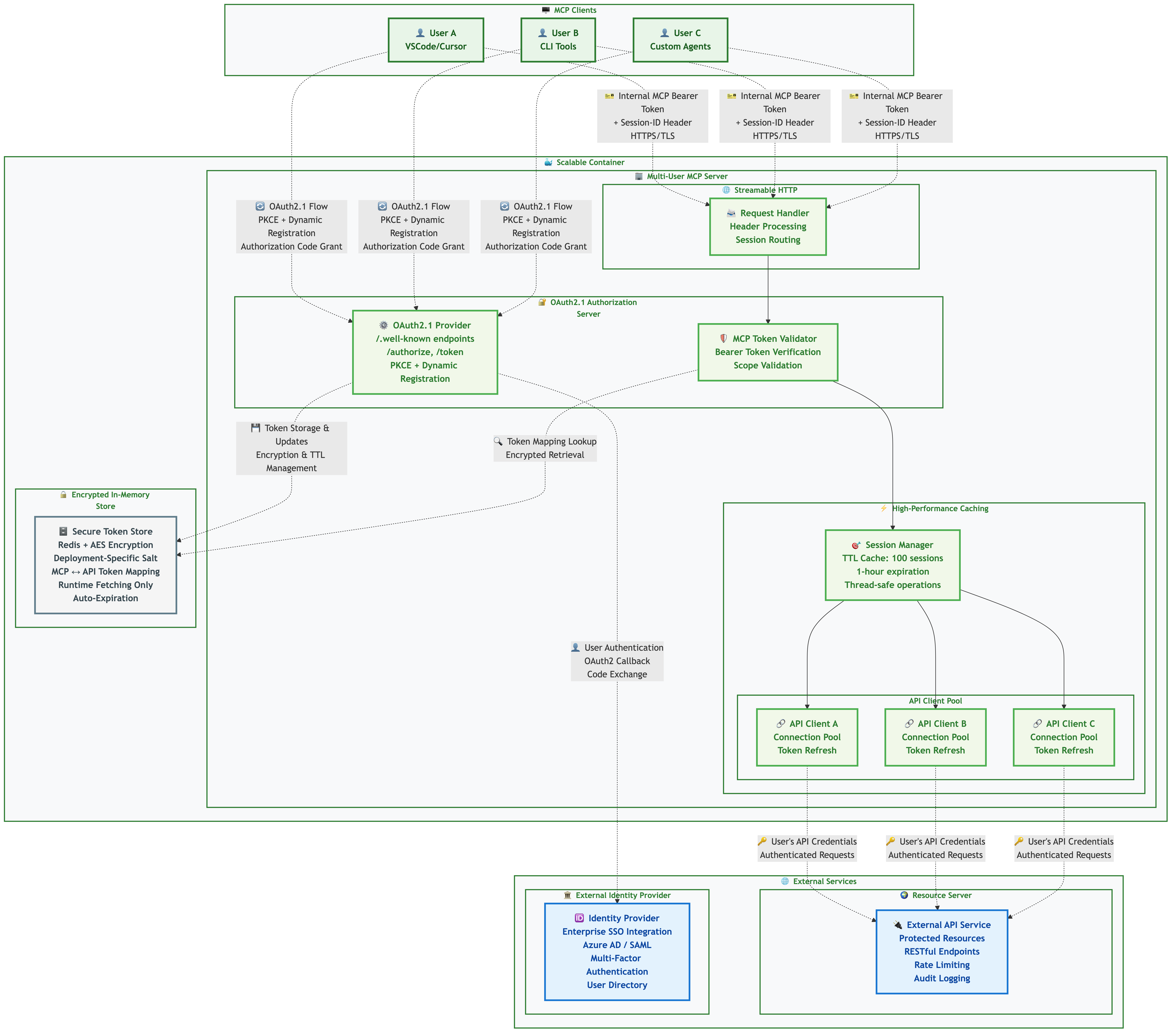 - Strong User isolation by design, Redis keys are uniquely generated per User using a combination of the MCP Session ID and a hash of the MCP internal token. These keys are created as part of the OAuth 2.1 flow, ensuring that sessions remain securely isolated. Each user receives an internal bearer token scoped only to their session, while the resource server bearer remains securely stored.