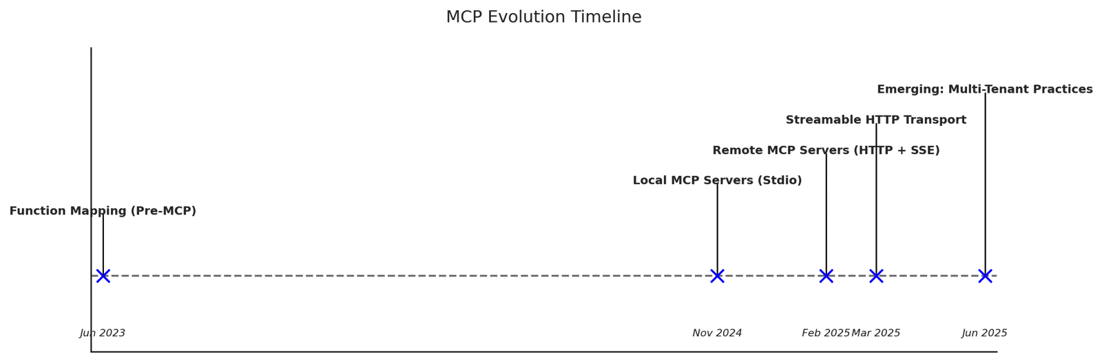 Over the past year, the integration of agentic AI tools has accelerated dramatically. We’ve moved from manual function mappings and fragile plugin APIs to standardized, protocol-driven interfaces. MCP helped streamline this evolution, beginning with local execution and expanding to remote communication over HTTP. Now, streamable communication and early patterns of multi-users are changing how agents interact with their environment. We illustrate this evolution in Figure 1 below.