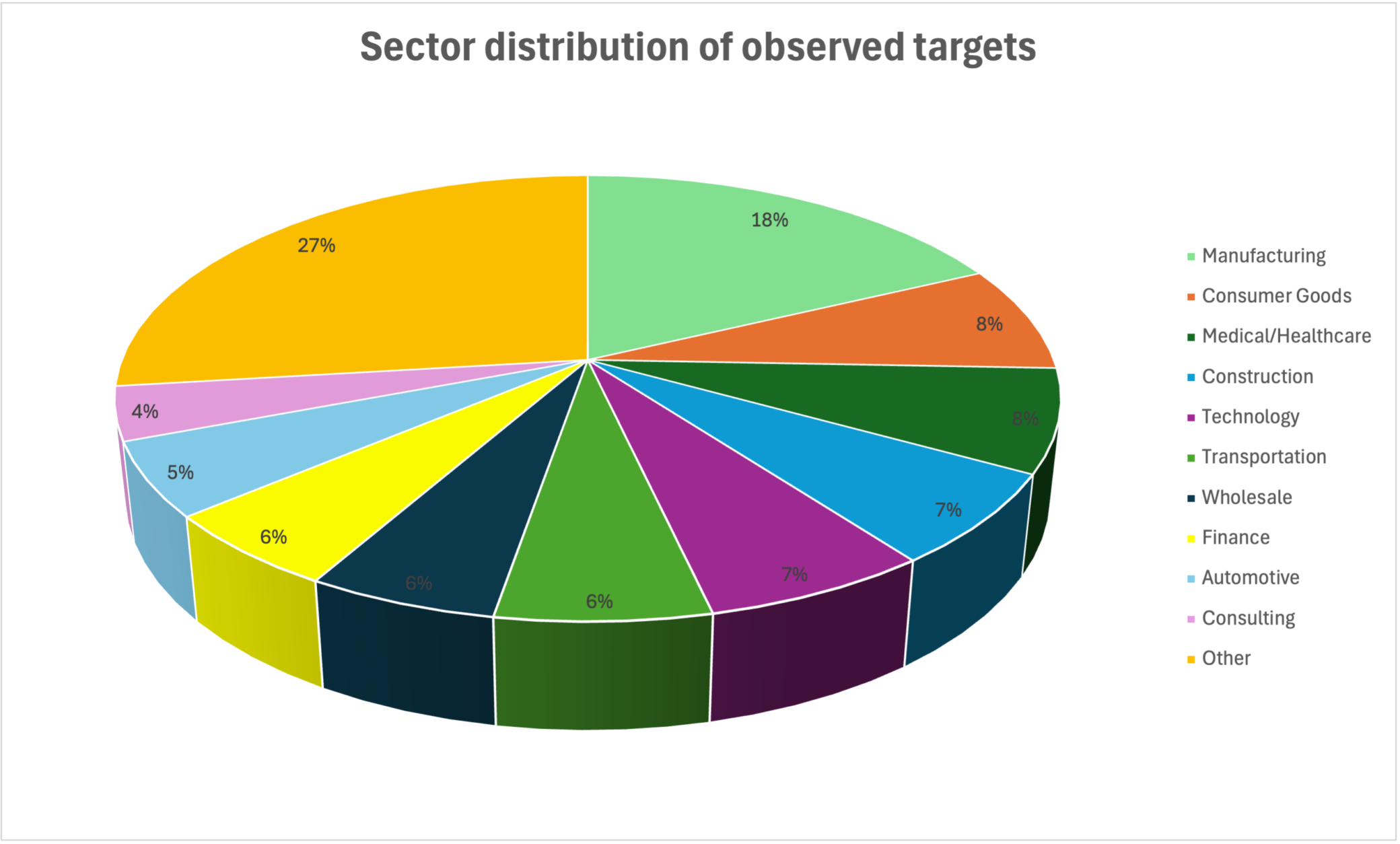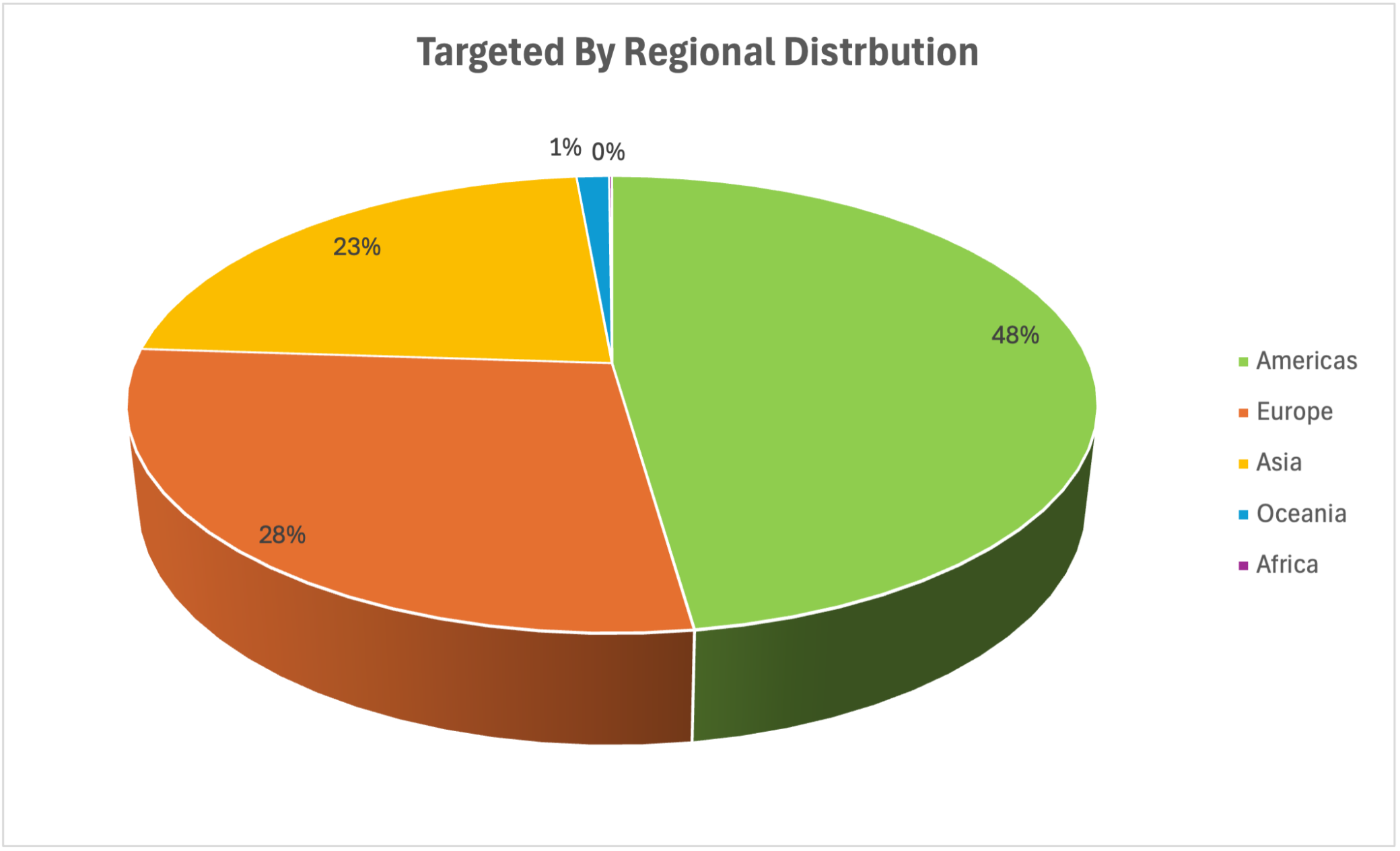 - Geographic spread: 70 countries targeted, led by the U.S. (36%).