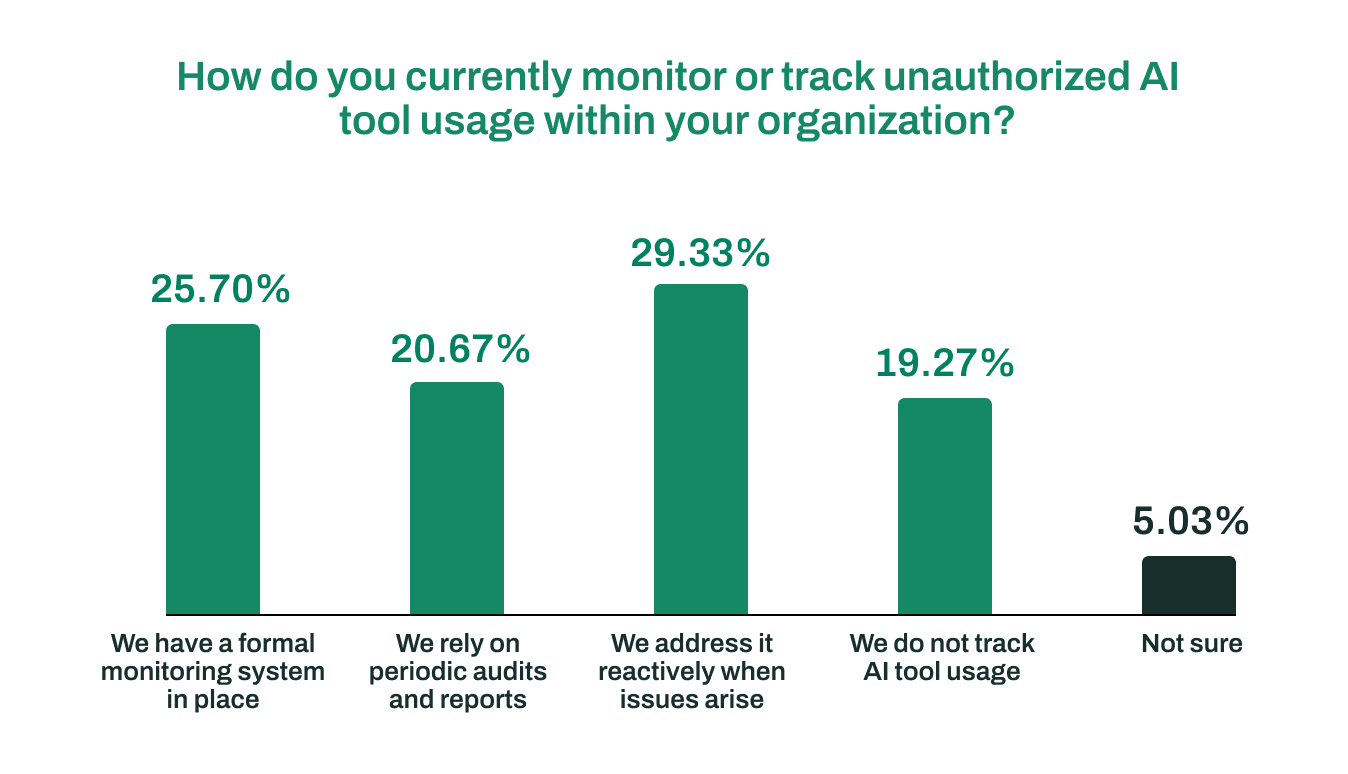Many IT teams have low or no visibility into AI usage. They can’t see which tools employees are using, how often, what they’re sharing, or what those tools are doing with their data. 69% percent of organizations still don’t have formal monitoring in place. Instead, they lean on occasional audits, reactive response, or don’t track usage at all.