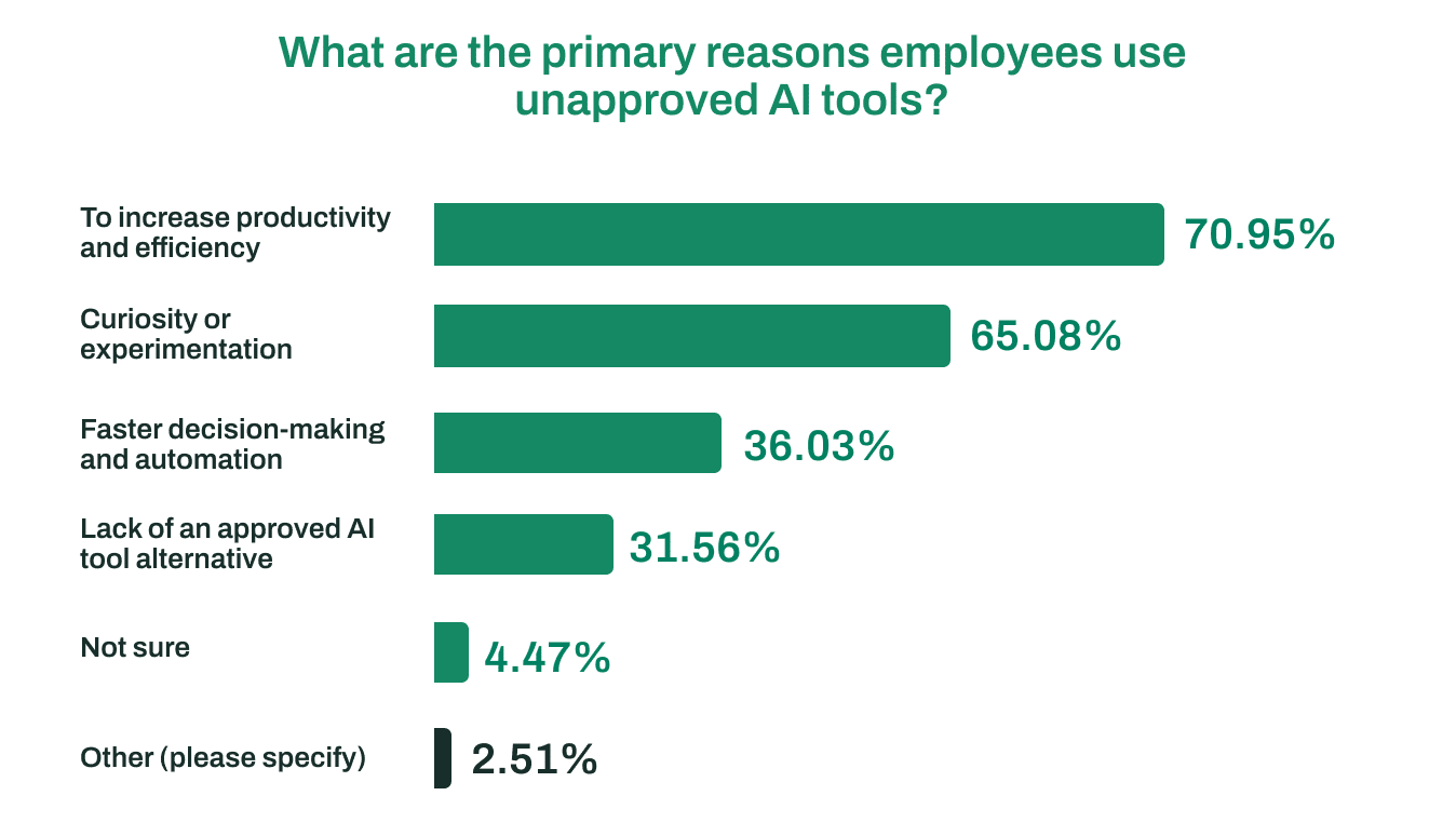 Most users have adopted AI because it speeds and improves outcomes, and they get more done. Nearly 71% of respondents in our survey say the primary driver for employees using unapproved tools is increased productivity and efficiency. When a tool saves time and adds value, people will use it, sanctioned or not.
