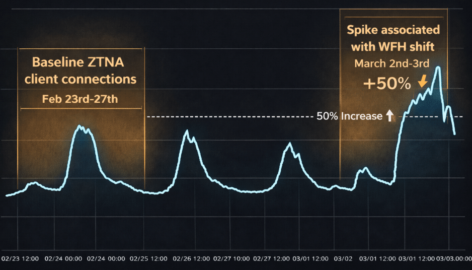 The significant increase came through remote connections. The traffic spike came from a significant increase in ZTNA connections. Cato Universal ZTNA (UZTNA) connects internal and external users to applications using a least-trust approach that combines identity and policy. A rapid increase like this is a strong indicator that many users who typically work from offices switched to home networks in a short window.